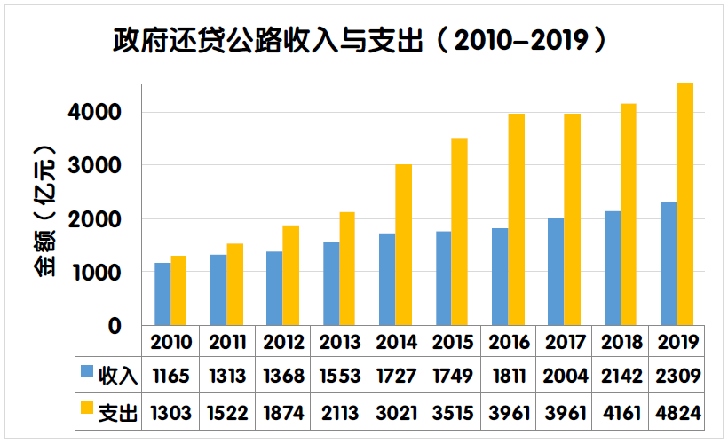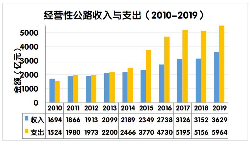 2019年度,全國收費公路收支平衡結果為-4849.8億元。其中,高速公路收支缺口4673.9億元,一級公路收支缺口176.3億元,二級公路收支盈余2.0億元,獨立橋梁及隧道收支缺口1.6億元。