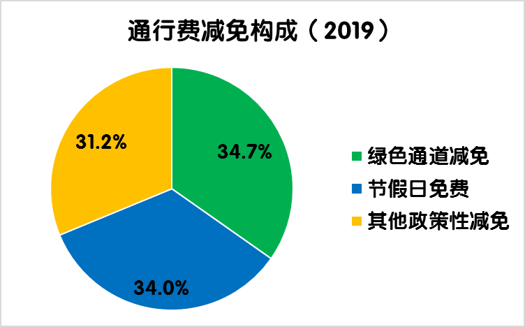 2019年度,全國收費公路共減免車輛通行費1009.7億元,占2019年度應收通行費總額的14.5%,比上年增加91.9億元,增長10%。其中,鮮活農產品運輸“綠色通道”減免350.8億元,占全年通行費減免總金額的比例為34.7%,比上年增加5.8億元,增長1.7%;重大節(jié)假日免收小型客車通行費343.7億元,占全年通行費減免總金額的比例為34.0%,比上年增加35.7億元,增長11.6%;高速公路差異化收費、ETC通行費優(yōu)惠、搶險救災車輛免費等其他政策性減免315.3億元,占全年通行費減免總金額的比例為31.2%。比上年增加50.4億元,增長19%。