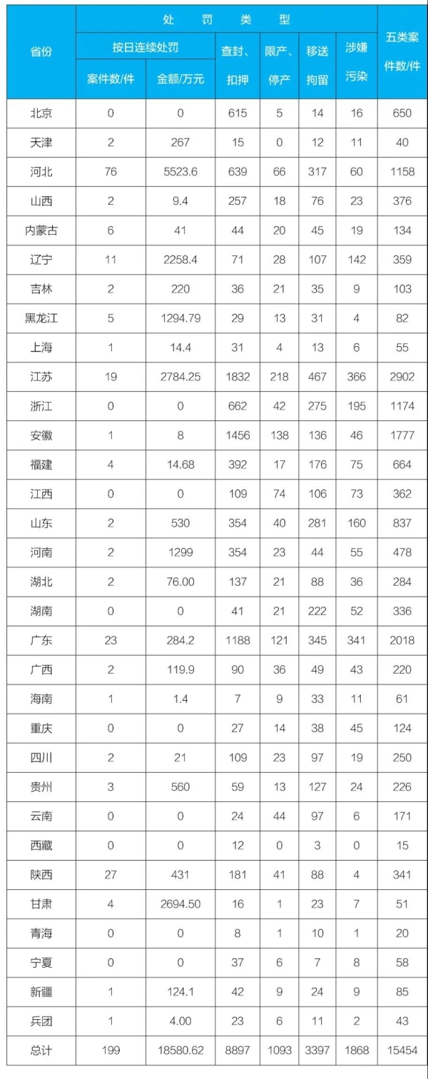 2021年1-12月,全國(guó)五類案件總數(shù)為15454件。其中,按日連續(xù)處罰案件數(shù)量為199件,罰款金額為18580.62萬(wàn)元;適用查封、扣押案件數(shù)量為8897件;適用限產(chǎn)、停產(chǎn)案件數(shù)量為1093件;移送拘留案件數(shù)量為3397件;移送涉嫌環(huán)境污染犯罪案件數(shù)量為1868件。