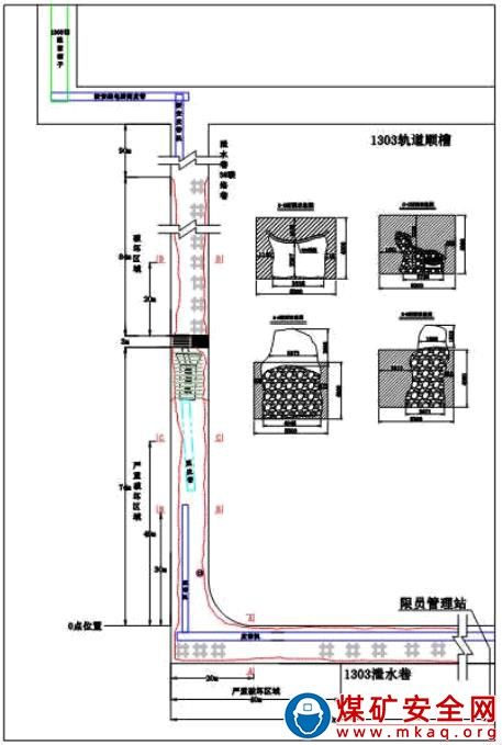1303 工作面泄水巷與 3 號(hào)聯(lián)絡(luò)巷拐點(diǎn)以外 100 米巷道,拐點(diǎn)向上 74 米巷道,共 174 米巷道出現(xiàn)不同程度破壞,其中嚴(yán)重段為拐點(diǎn)以外 40 米巷道及拐點(diǎn)向上 74 米巷道,共計(jì) 114 米;3 號(hào)聯(lián)絡(luò)巷貫通點(diǎn)向上 174 米巷道出現(xiàn)不同程度破壞,其中嚴(yán)重段為貫通點(diǎn)以上 84 米巷道。破壞巷道共計(jì) 348 米,其中嚴(yán)重破壞段為198 米。巷道破壞位置見(jiàn)圖 4,具體情況如下: