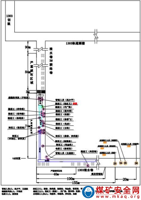 掘二隊(duì) 7 人正在距離拐點(diǎn) 155 米以外砌筑水溝,當(dāng)班驗(yàn)收員夏付人也在這個(gè)位置,沖擊氣浪將其安全帽沖掉。發(fā)生事故后,夏付人和其他 7 人一起往外撤。