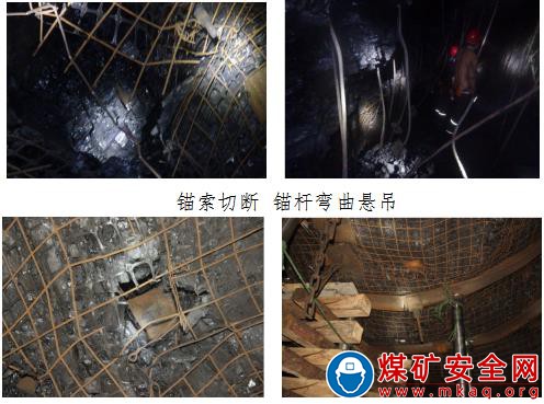 拉伸頸縮,表明巷道破壞瞬間錨桿、錨索承受了水平載荷作用,頂部煤體在水平?jīng)_擊載荷作用下發(fā)生碎脹變形,可以推斷頂煤冒落的主要原因是在破壞瞬間,巷道頂部煤體在沖擊載荷作用下發(fā)生碎脹變形,導(dǎo)致錨桿、錨索無(wú)法對(duì)其進(jìn)行有效約束。