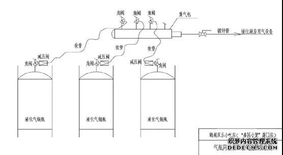 氣瓶間南北向?qū)?.5米,東西向長6米。沿北墻由西向東依次放置冰箱一臺、50Kg空瓶5只(編號為1#、2#、3#、4#、8#);沿南墻由西向東依次設置油水分離器一套、冰箱一臺、50Kg液化石油氣鋼瓶3只(編號由南向北依次9#、6#、7#)。9#、6#、7#鋼瓶中的液化石油氣通過調(diào)壓閥、燃氣橡膠軟管連接至集氣包,由集氣包向二樓廚房間送氣。