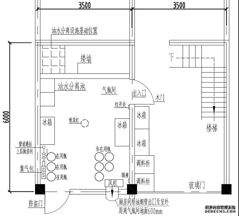 廚房間設置在氣瓶間樓上(東側(cè)建筑的二樓),南側(cè)由西往東依次擺放:雙眼炒灶、不銹鋼雙層工作臺、蒸煮爐、單頭矮仔爐、湯爐、頂上吊不銹鋼煙罩;東側(cè)由南向北依次擺放:蒸包子爐、不銹鋼水槽等。廚房間內(nèi)燃氣鍍鋅鋼管從一樓氣瓶間西南角立管延伸至二樓廚房間,沿踢腳線敷設鍍鋅鋼管,管上裝有6個”三通”,通過“三通”和支管閥門連接燃氣橡膠軟管直供雙眼炒灶1臺,其他燃器具依次由DN25鍍鋅鋼管(輸氣總管)經(jīng)“三通”及角閥與家用調(diào)壓器連接二次減壓后,分別通到蒸煮爐2臺、單頭矮仔爐2臺、湯爐1臺、蒸包子爐1臺使用。