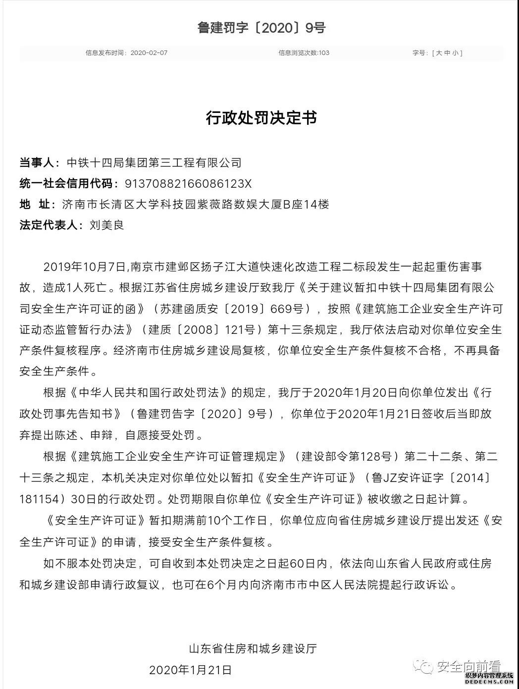 省住房城鄉(xiāng)建設廳魯建罰字〔2020〕9號行政處罰決定書顯示,2019年10月7日,南京市建鄴區(qū)揚子江大道快速化改造工程二標段發(fā)生一起起重傷害事故,造成1人死亡。根據江蘇省住房城鄉(xiāng)建設廳致我廳《關于建議暫扣中鐵十四局集團有限公司安全生產許可證的函》(蘇建函質安〔2019〕669號),按照《建筑施工企業(yè)安全生產許可證動態(tài)監(jiān)管暫行辦法》(建質〔2008〕121號)第十三條規(guī)定,我廳依法啟動對中鐵十四局三公司安全生產條件復核程序。