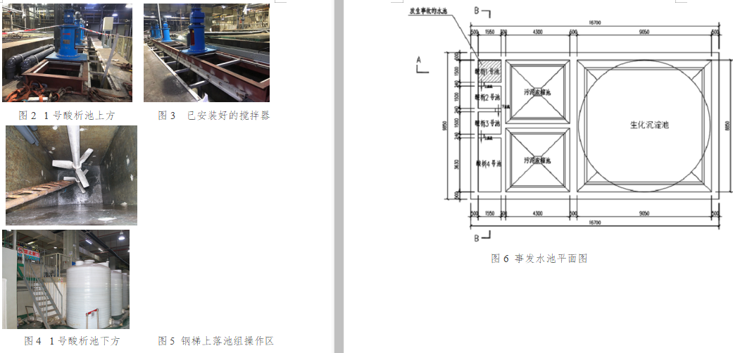 截至2019年5月14日,三期項(xiàng)目整體工程進(jìn)度已完成70%左右,其中排放系統(tǒng)(廢水處理系統(tǒng))已完成45~50%。事故發(fā)生前,1、2、3、4號(hào)酸析池上方均已安裝好攪拌器,攪拌器采用角鋼及鐵架固定,未放水進(jìn)行調(diào)試。(現(xiàn)場(chǎng)情況見圖2-5)