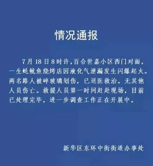 兩名路人被碎玻璃劃傷,已送醫(yī)救治,無(wú)其他人員傷亡。救援人員第一時(shí)間趕赴現(xiàn)場(chǎng),目前明火已撲滅,進(jìn)一步調(diào)查正在開展中。