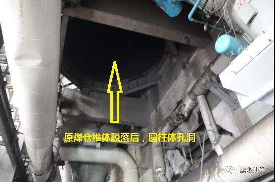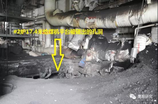 現場檢查,#2爐2D原煤倉下部錐體部脫落,砸壞2D給煤機平臺,連同給煤機墜落至#2鍋爐零米,2D給煤機損壞、2C、2D磨煤機油站、2D磨煤機、給煤機附近區(qū)域電纜、輔汽聯箱管道等設備不同程度受損,無人員傷害及主設備損壞。(堵煤次數太多,敲塌了?)