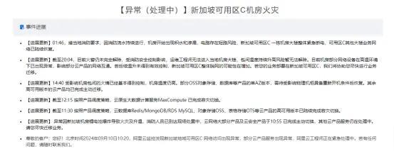 火災(zāi)公告顯示,11日凌晨01:46,接當(dāng)?shù)叵酪螅蛳罎菜掷m(xù)進(jìn)行,機(jī)房開(kāi)始出現(xiàn)積水和滲漏,電路存在短路風(fēng)險(xiǎn),新加坡可用區(qū)C一棟?rùn)C(jī)房大樓整體緊急斷電,可用區(qū)C其他大樓業(yè)務(wù)網(wǎng)絡(luò)已陸續(xù)恢復(fù)。