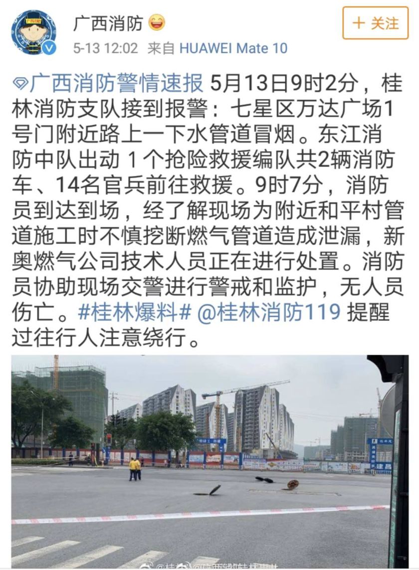 中午12時(shí),@廣西消防官微發(fā)布了一警情速報(bào):5月13日9時(shí)2分,桂林消防支隊(duì)接到報(bào)警:七星區(qū)萬達(dá)廣場(chǎng)1號(hào)門附近路上一下水管道冒煙。9時(shí)7分,消防員到達(dá)到場(chǎng),經(jīng)了解現(xiàn)場(chǎng)為附近和平村管道施工時(shí)不慎挖斷燃?xì)夤艿涝斐尚孤?新奧燃?xì)夤炯夹g(shù)人員正在進(jìn)行處置。消防員協(xié)助現(xiàn)場(chǎng)交警進(jìn)行警戒和監(jiān)護(hù),無人員傷亡。
