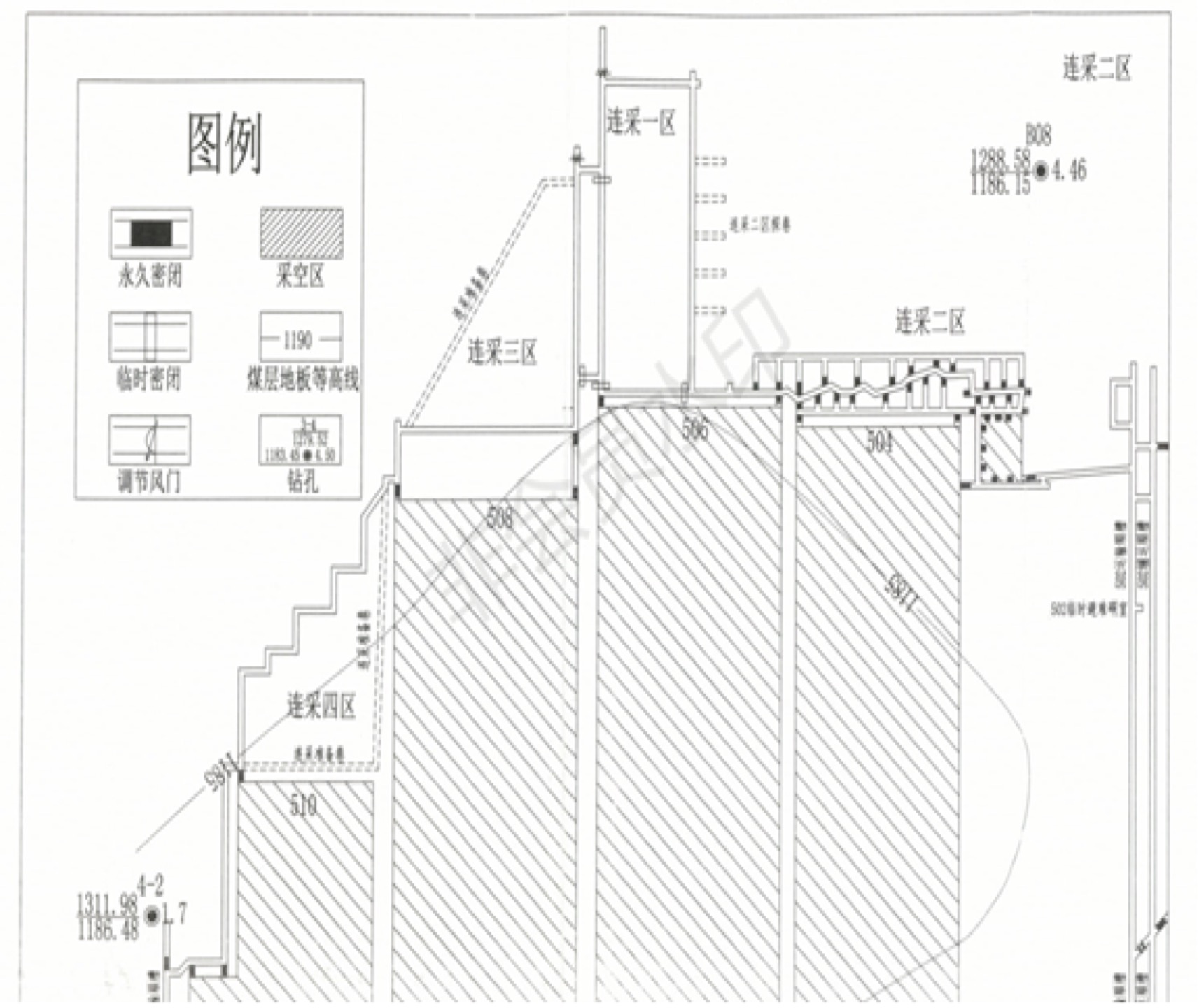 1.違法進入老空組織回采,開采老空保安煤柱 。一是回采方案和506連采工作面作業(yè)規(guī)程中設(shè)計的部分支巷位于采空區(qū)保安煤柱范圍內(nèi)。二是超出回采方案和作業(yè)規(guī)程中506連采工作面開采范圍,違法組織開采采空區(qū)煤柱。