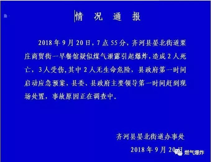 20日上午,10時左右,齊河縣晏北街道辦事處對外發(fā)布《情況通報》稱,2018年9月20日,齊河縣晏北街道栗莊商貿(mào)街一早餐館疑似煤氣泄漏引起爆炸,造成2人死亡,3人受傷,其中2人無生命危險,縣政府第一時間啟動應急預案,縣委、縣政府主要領(lǐng)導第一時間趕到現(xiàn)場處置,事故原因正在調(diào)查中。