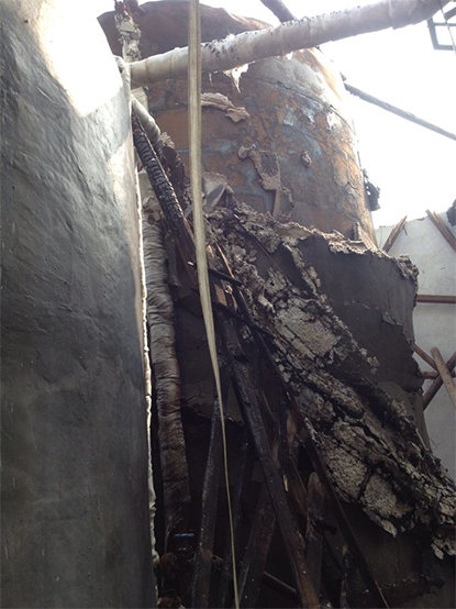 現(xiàn)場勘察發(fā)現(xiàn),3號罐輸送至1號罐的輸送管水平距離為10米,并用保溫材料進行保溫。爆炸現(xiàn)場1號罐固定頂被炸飛,另兩只儲罐完好。爆炸的1號罐罐頂材質(zhì)為厚度5mm的鐵板,自制而成。內(nèi)壁較為粗糙,進料口附近約50cm的范圍內(nèi)有熏黑的痕跡,未煙熏部分有鐵銹。罐頂設(shè)有人孔蓋和放空口,在人孔蓋附近無保溫材料,外壁有明顯燃燒的痕跡,人孔蓋與罐頂原有焊接縫處的焊接片脫落,說明罐頂外壁燃燒有一段時間。被結(jié)晶萘堵塞點位于1號罐罐頂進料口水平距離約40cm,垂直距離約40cm,堵塞點與進料口連接的法蘭已拆除;現(xiàn)場留有氣割槍等工具。