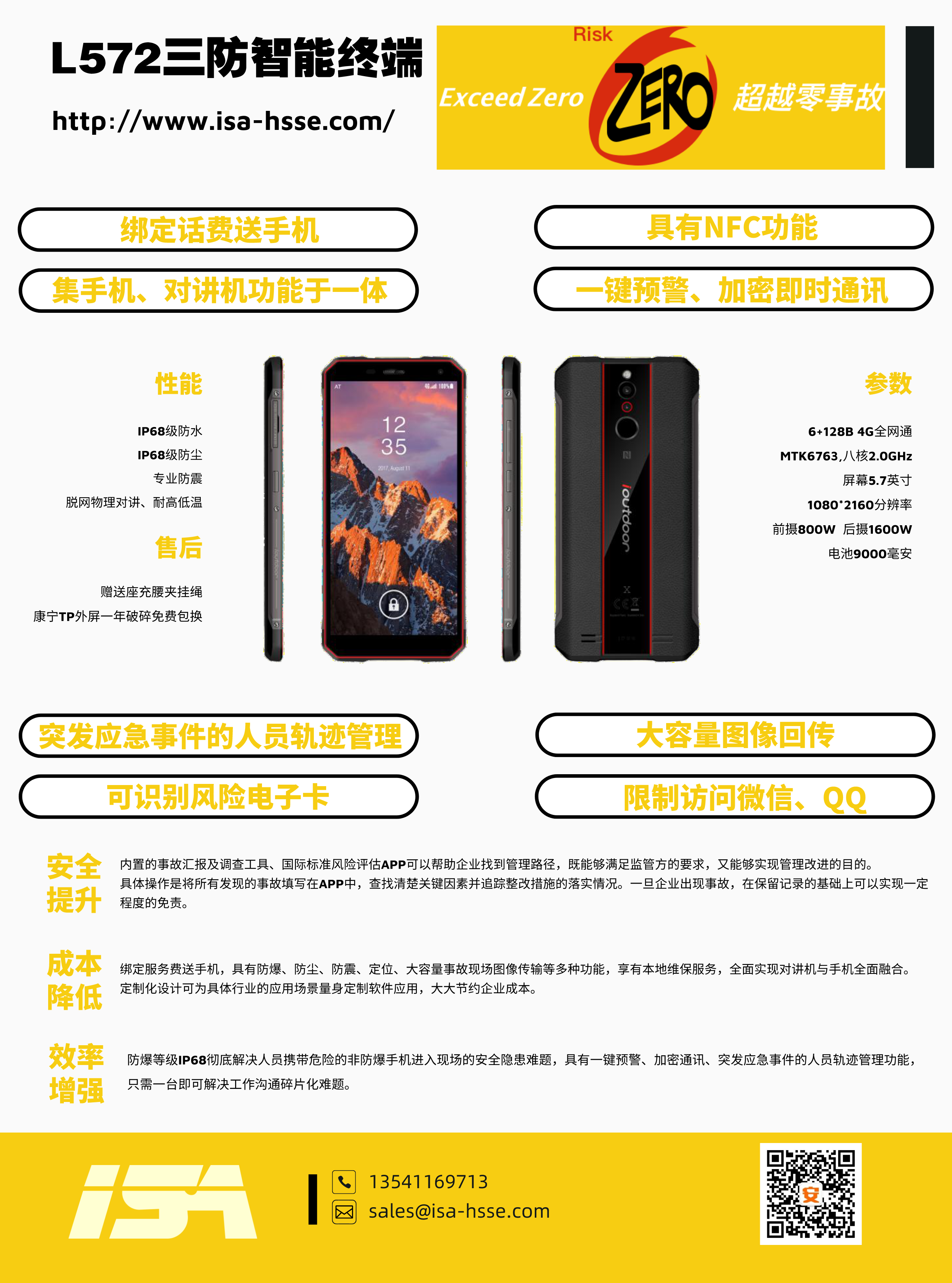 公司與運營商推出一款集手機、對講機于一體的防爆手持終端,包括各類商業(yè)安全軟件的使用、圖像回傳功能、一鍵報警、限制訪問微信QQ、NFC等功能。內(nèi)含事故管理APP(隱患排查、風(fēng)險評估),0元開卡,綁定即送話費流量,支持定制化服務(wù)。